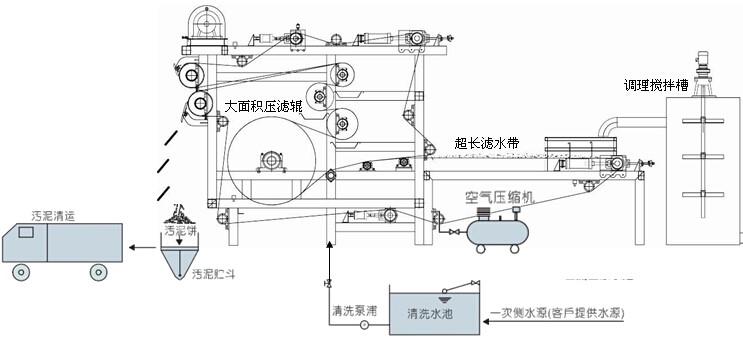 網(wǎng)帶式壓濾機可以處理其他壓濾機無法處理的污泥和各種含水量較高的物料。